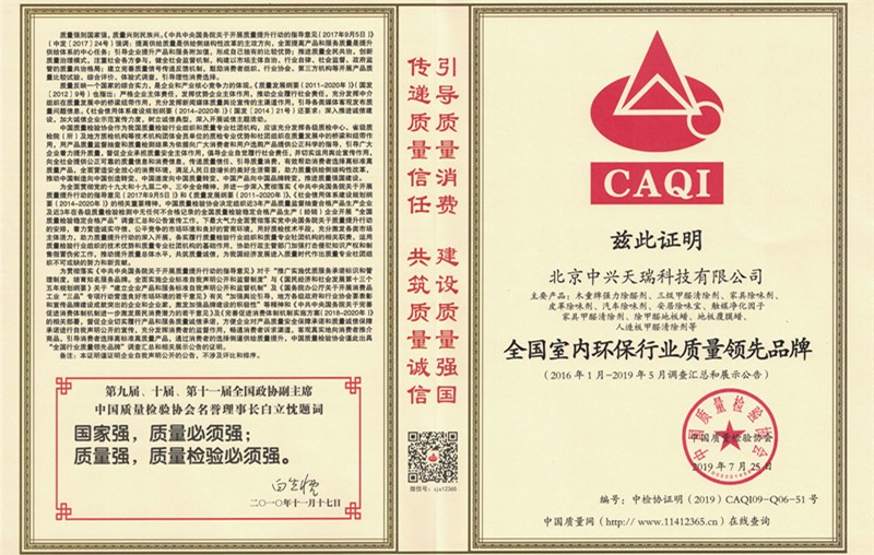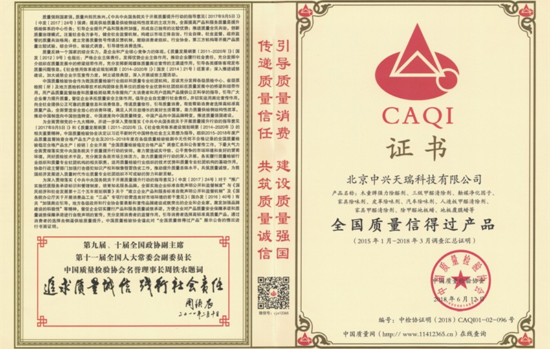2018年木童除甲醛除異味系列室內空氣污染治理產品憑借其核心技術優勢和過硬的產品質量以及空氣治理明顯效果,再次榮獲“全國質量信得過產品”榮譽稱號。