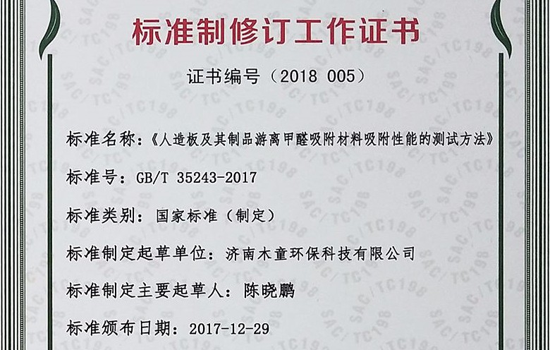 2018年人造板及其制品游離甲醛吸附材料吸附性能的測試方法國標制定參與證書